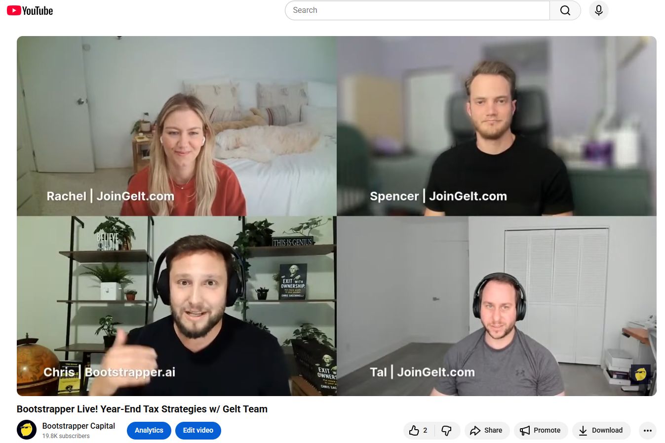 This past week we had our friends from JoinGelt.com join us on Bootstrapper Live! and they delivered a world-class breakdown of Year-End Tax Strategies that can literally put cash back in your pocket.